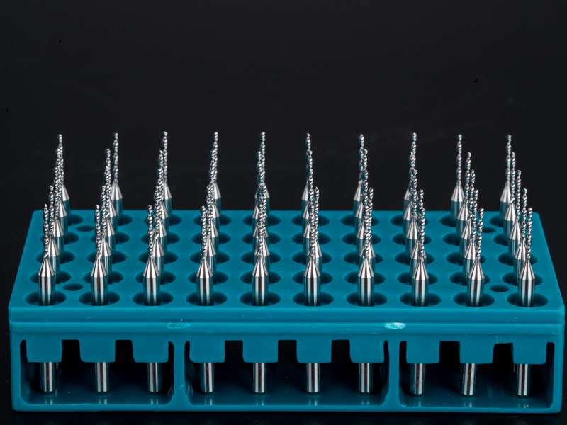 Tungsten Carbide Drills with steel shank, special flute (Undercut/Spade Type), variable Web design and a shank dia. of 3.175 mm, in the dia. range of 0.15-0.80 mm, to be used for multilayer PCBs with filled materials and for high TG and BT resins, specially designed for high RPM drilling spindles > 200.000 U/min, stands out for good chip removal, extremely low drill breakage and im